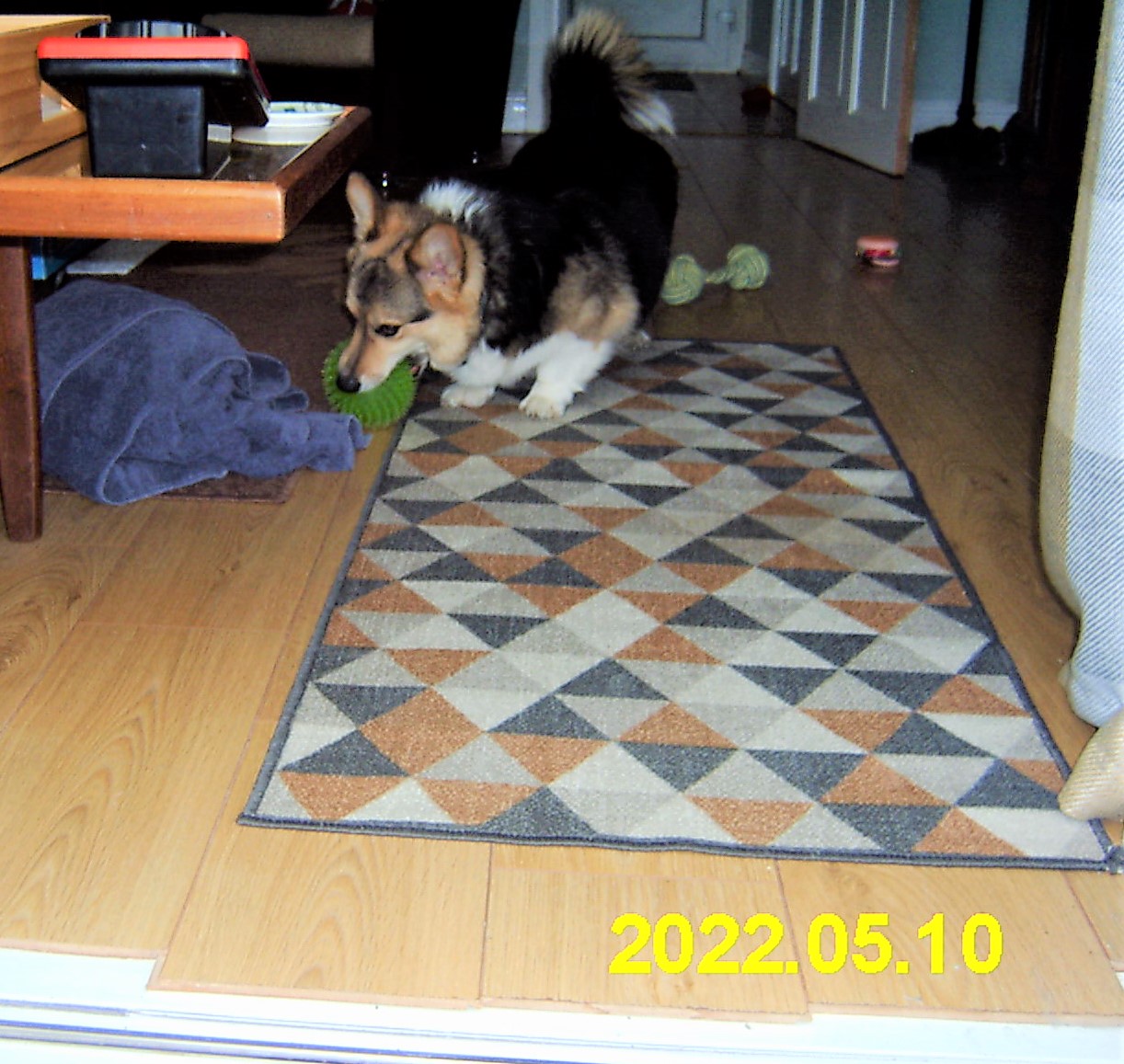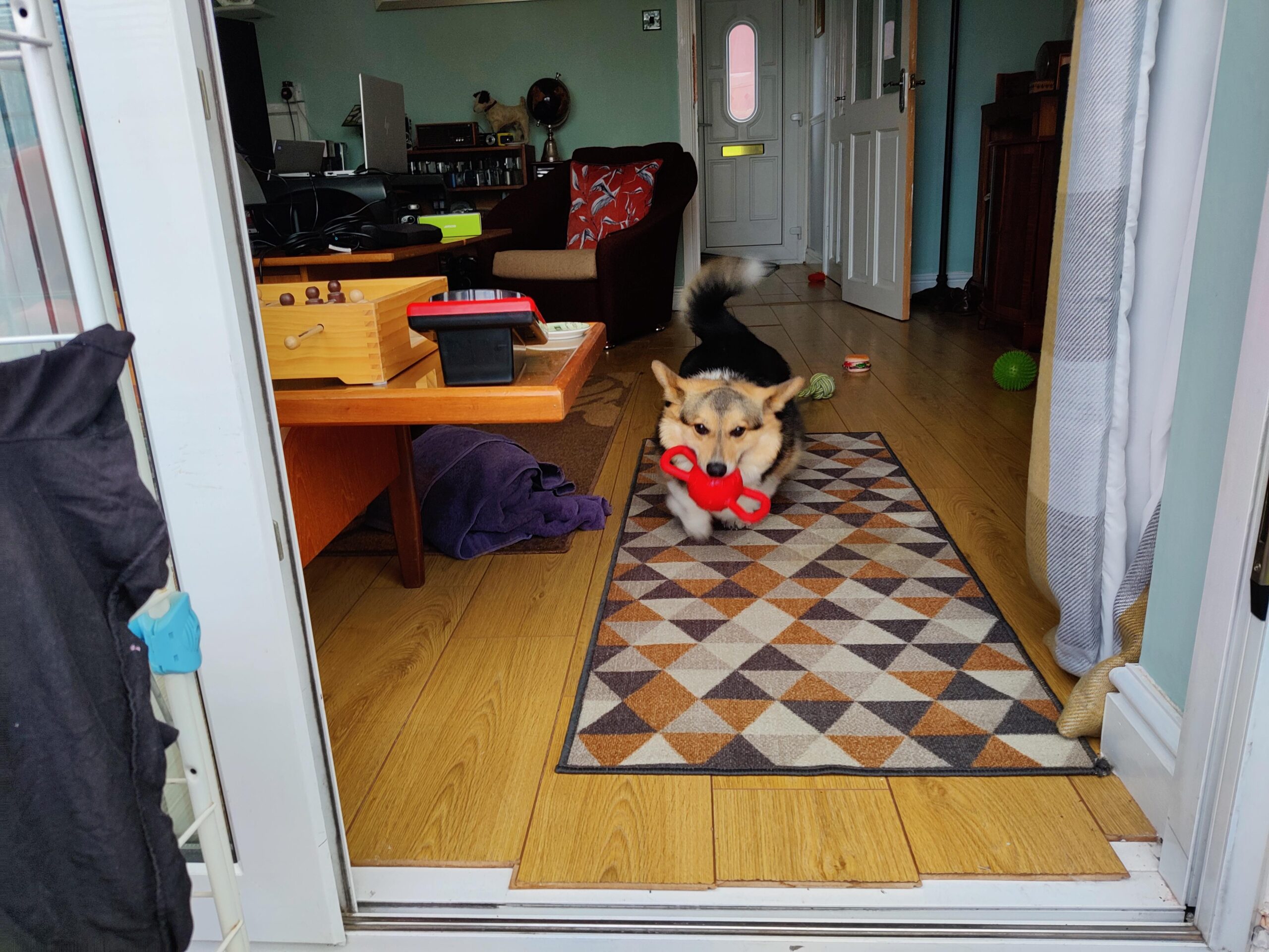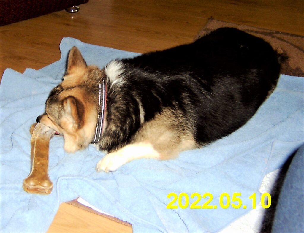 Yoda has arrived this morning, and very excited he was too! Naturally he was given a treat (dental stick), had some play with his ball and padawan and has now settled down to eat a rawhide bone while Andrew gets on with some work.